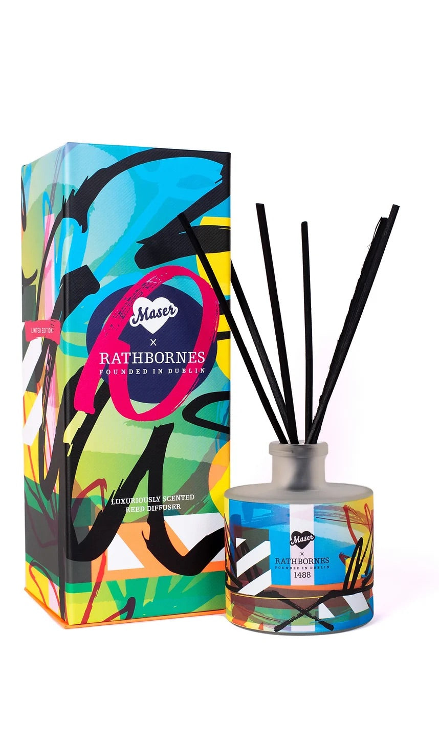 Beautifully packaged with Maser’s unique signature striking colourful graphic style, this 200ml reed diffuser features top notes of dark plum and davana, blended with saffron on a base of smoked cedarwood, aged leather suede and amber. This fragrance was inspired by Maser's love for the outdoors that he rediscovered during lockdown carrying smokey tones reminiscent of story telling around a camp fire while evoking a sense of relaxation and calm.